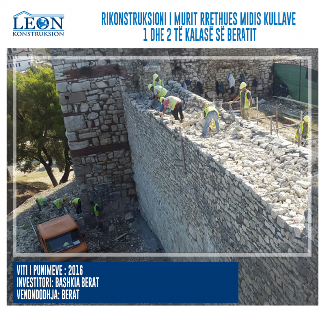 Rikonstruksioni i murit rrethues midis kullave 1 dhe 2 te kalase se Beratit RestaurimeBy leonAugust 6, 2016Kalaja e Beratit