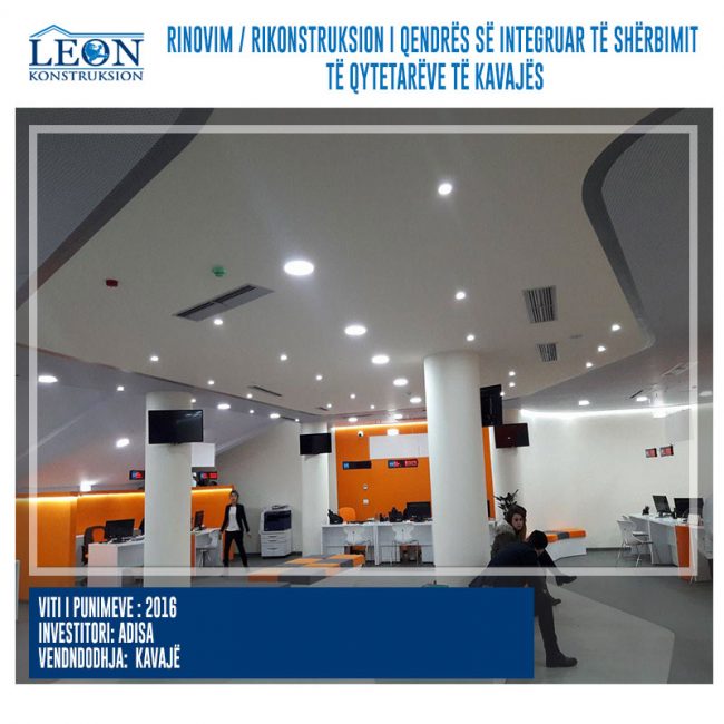 Rinovim /rikonstruksion i Qendres se Integruar te Sherbimit te qytetareve te Kavajes NdertimeBy leonMay 7, 2016SHERBIME PUBLIKE TE INTEGRUARA KAVAJE