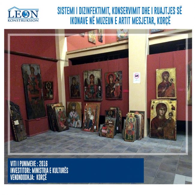 Sistemi i disifektimit, konservimit dhe i ruajtjes se ikonave ne Muzeun e Artit Mesjetar, Korce (Qendra per mbrojtjen dhe promovimin e kultures) RestaurimeBy leonJune 27, 2016 Muzeun e Artit Mesjetar, Korce