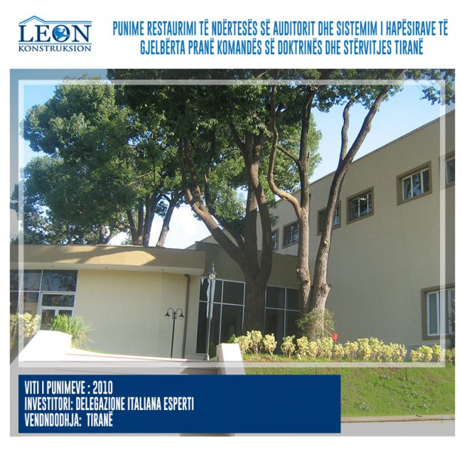 Punime restaurimi te nderteses se auditorit dhe sistemim i hapesirave te gjelberta prane komandes se doktrines dhe stervitjes, Tirane